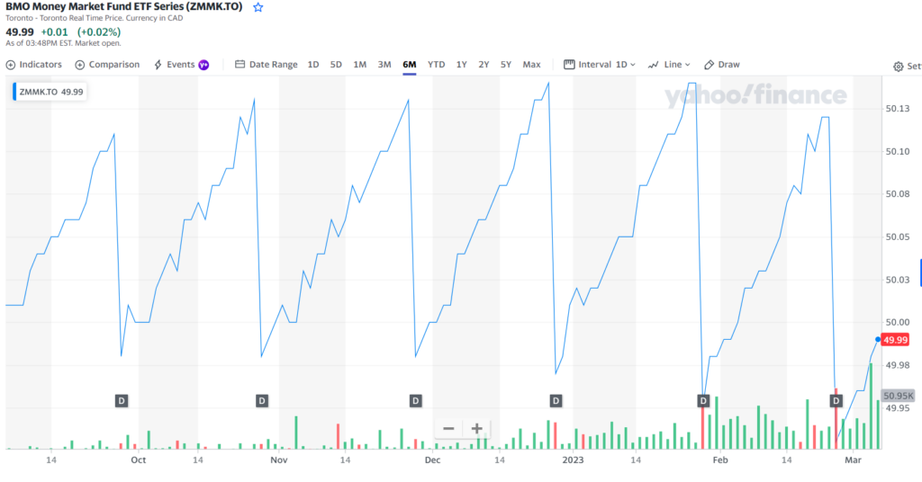 This ETF is invested in Canadian corporate and government bonds with less than one year til maturity. I feel this short-term nature gets me some higher interest rates. Currently, it’s yielding 4.69%. That is relatively safe money as long as rates don’t go much higher from here. The Bank of Canada has indicated a pause in rates for the short term, and inflation has been coming down.
