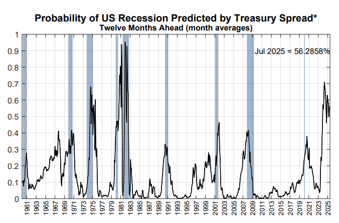 The US Federal Reserve puts the probability of a recession within the next twelve months at 56%.