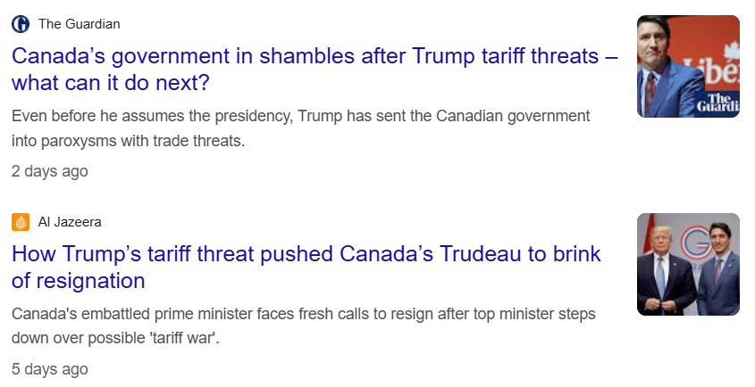 And if Canada is somehow able to avoid tariffs, they’d have to make certain concessions to the US in order for that to happen. More harm to Canadian business. An increase in imports and a reduction of exports is the goal. That’s not good, long term.