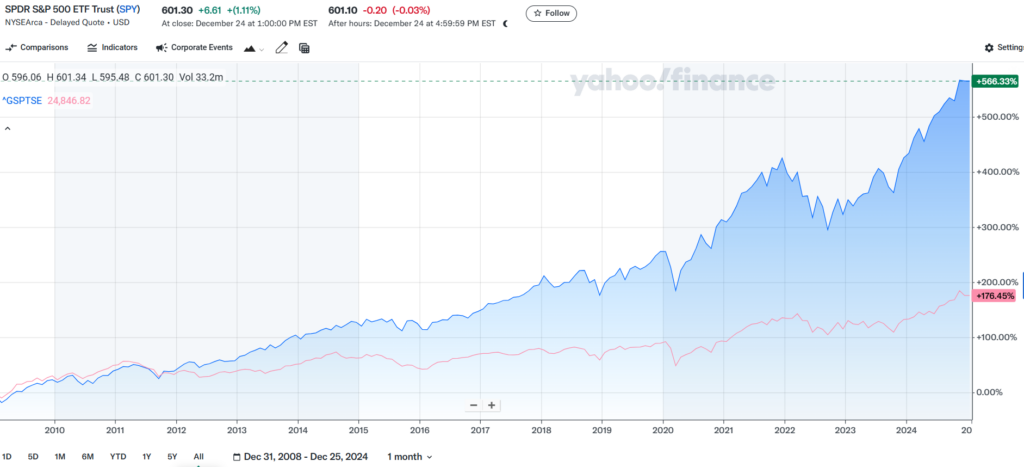 $10,000 invested into Canada in 2009 would be $27,645 today. While the same $10,000 invested in the S&P 500 would be $66,633.