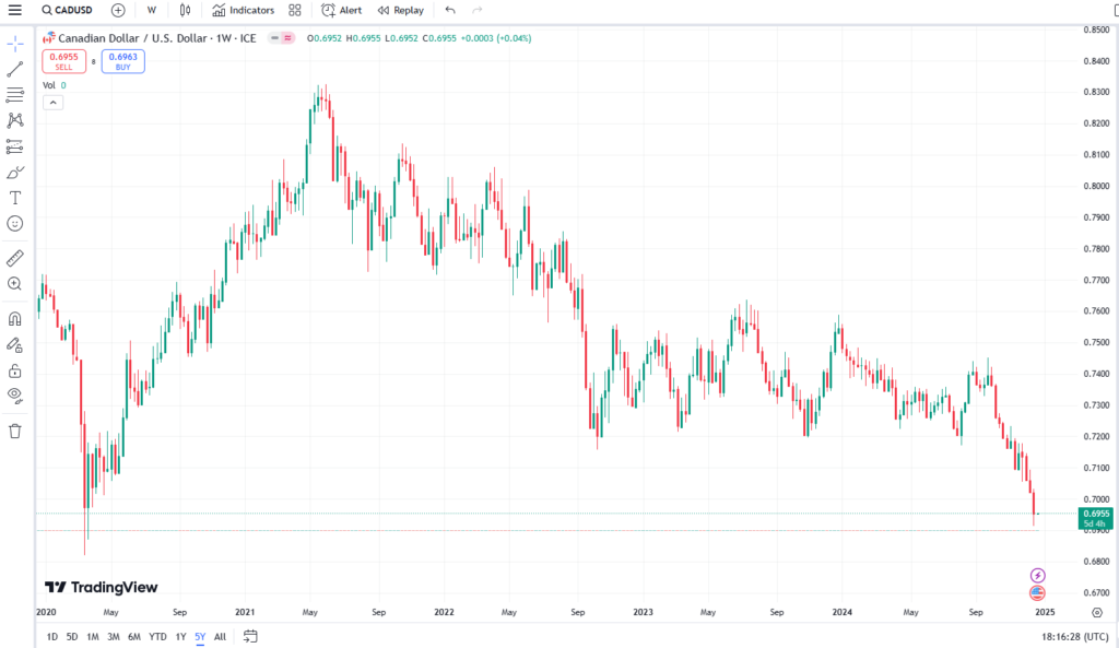 The Canadian Dollar can be purchased for $0.6955 US at the current time. And experts predict that will continue to go lower.