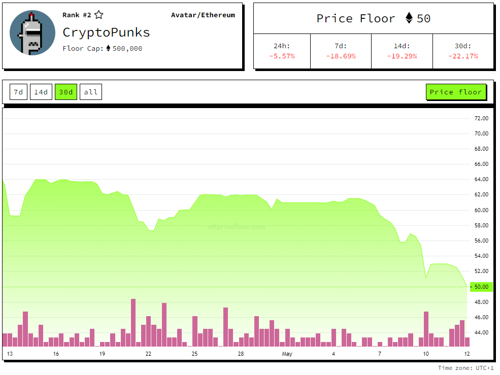NFTs will also be caught by this. NFTs are priced in cryptocurrency, so a 50% drop in $ETH will affect their price as well. But the so-called “floor price” for many popular NFT projects is starting to fall.